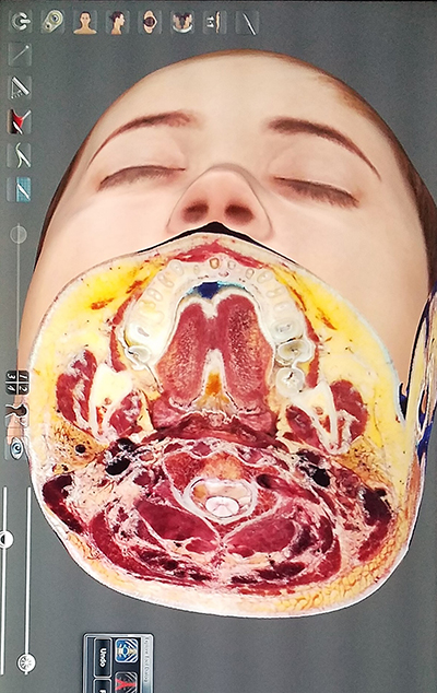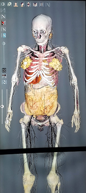 The life-size virtual cadaver – which can be switched from male to female, per the discretion of the instructor – can be viewed and manipulated from an endless combination of angles and through all tissue levels. Users can zoom in on areas of interest to the level of individual vascular structures and can slice through any combination of muscle and bone with the swipe of a single finger, as opposed to a scalpel.