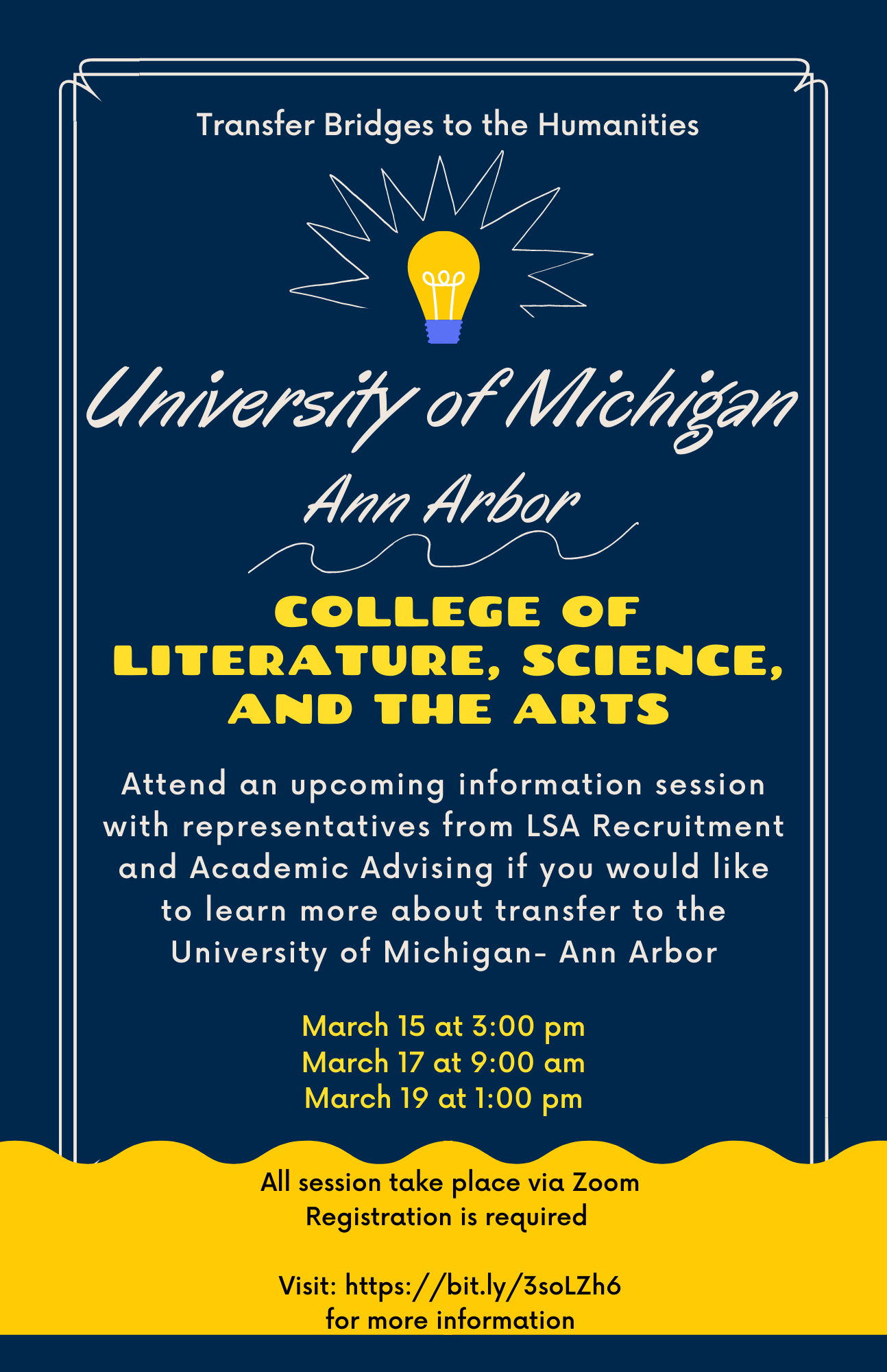 Join Recruitment and Advising representatives from the University of Michigan - Ann Arbor College of Literature, Science, and the Arts (LSA) to learn more about transfer basics and the components of our Liberal Arts degree. We will begin with a brief presentation about the College of LSA, the Transfer Bridges to the Humanities Program, and our LSA degree requirements before opening it up to your questions.
